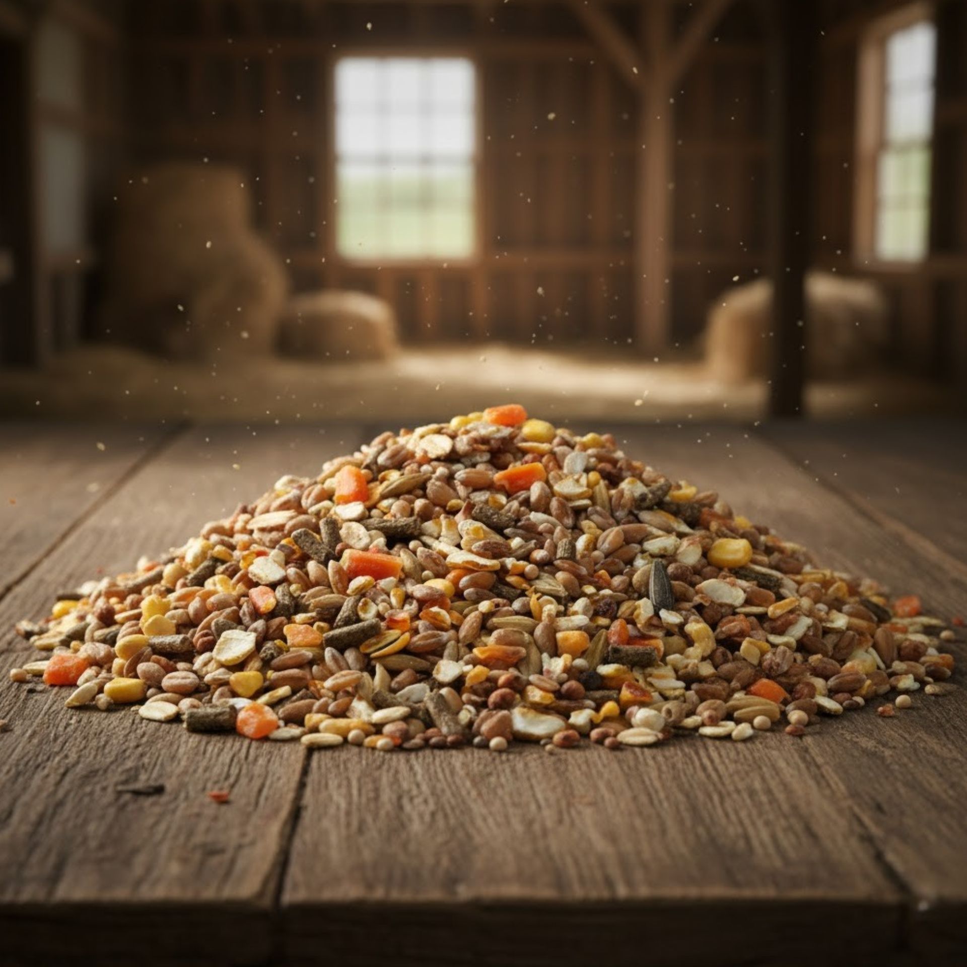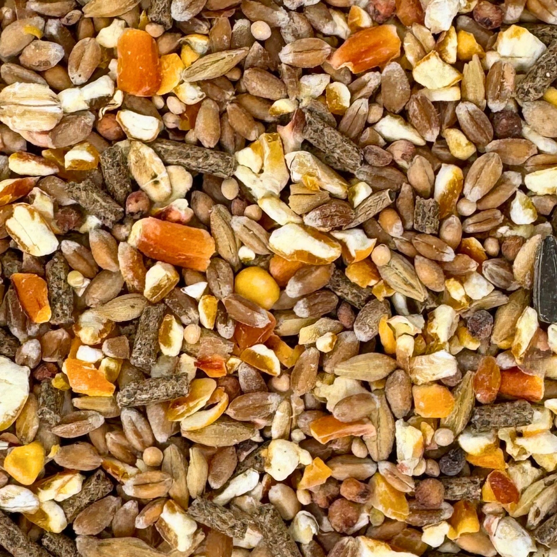 5% geschroteter Mais, 8% Braugerste, 35% Weizen, 4% Gelbhirse, 2% gestreifte Sonnenblumenkerne, 1% Mariendistelsamen, 3% Milokorn, 10% Immun Plus-Pellets und 2% Haferflocken.