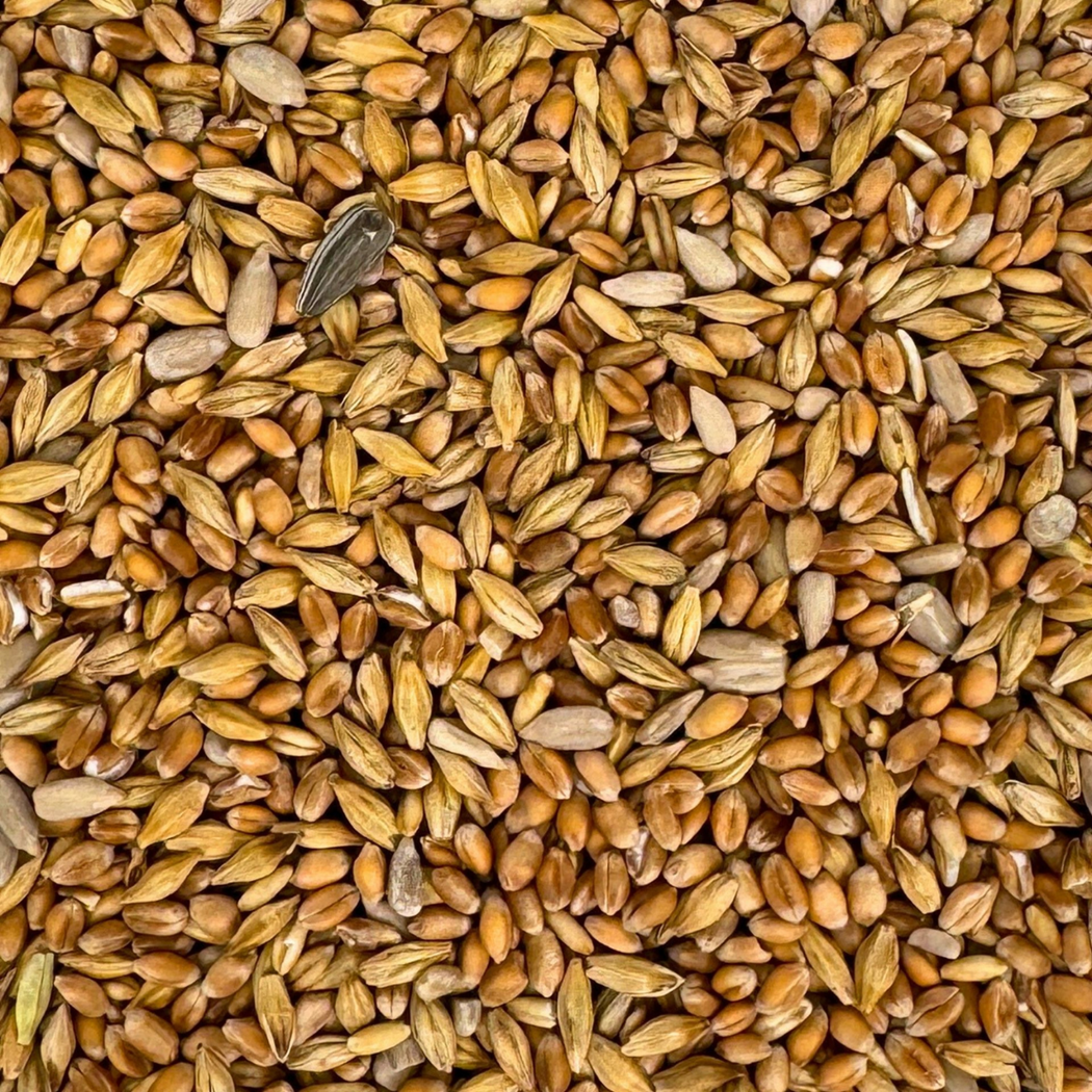 Zusammensetzung: 50,0 % Weizen, 34,0 % Braugerste, 9,0 % Rollhafer, 7,0 % geschälte Sonnenblumenkerne