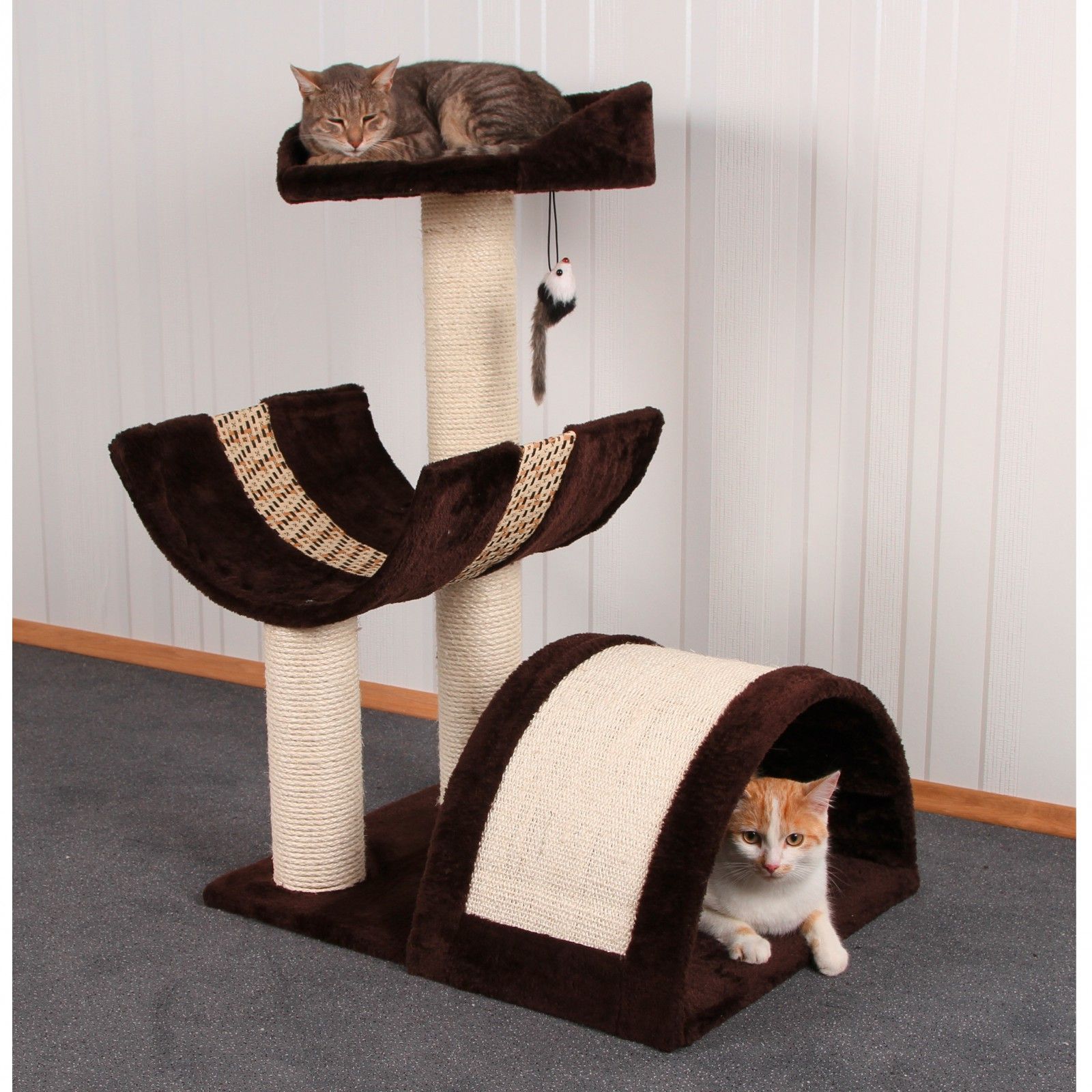 Dieser Kratzbaum mit Liegebett, einem gewölbtem Kratzbrett und Liegemulde passt sehr gut in jedes Wochenende. Die Spielmaus lädt auf spannende Spielabenteuer ein.