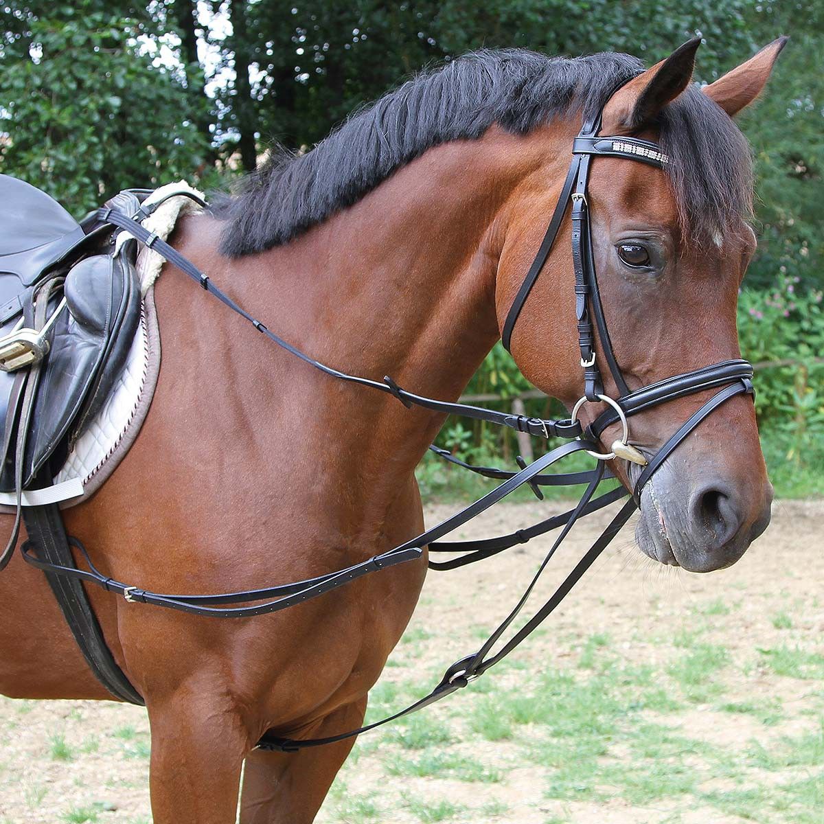 Dieser Zügel ist eine abgewandelte Form des Ausbinders und schafft mehr Möglichkeit in der Vorwärts- / Abwärtsbewegung des Pferdes als normale Ausbinder oder Stoßzügel. Die Dreieckzügel sind nach §70 LPO auf Turnieren zugelassen. Verstellbar.
