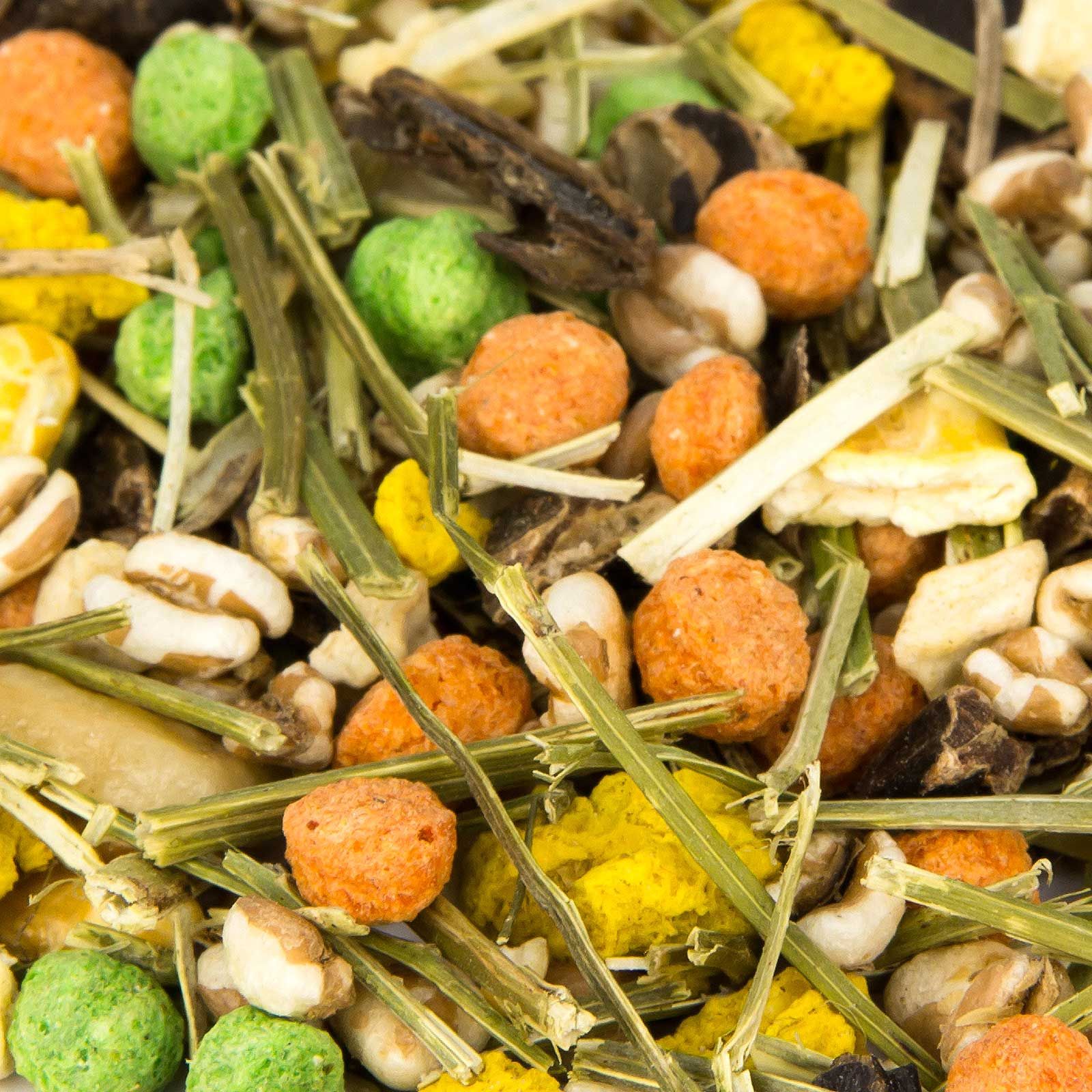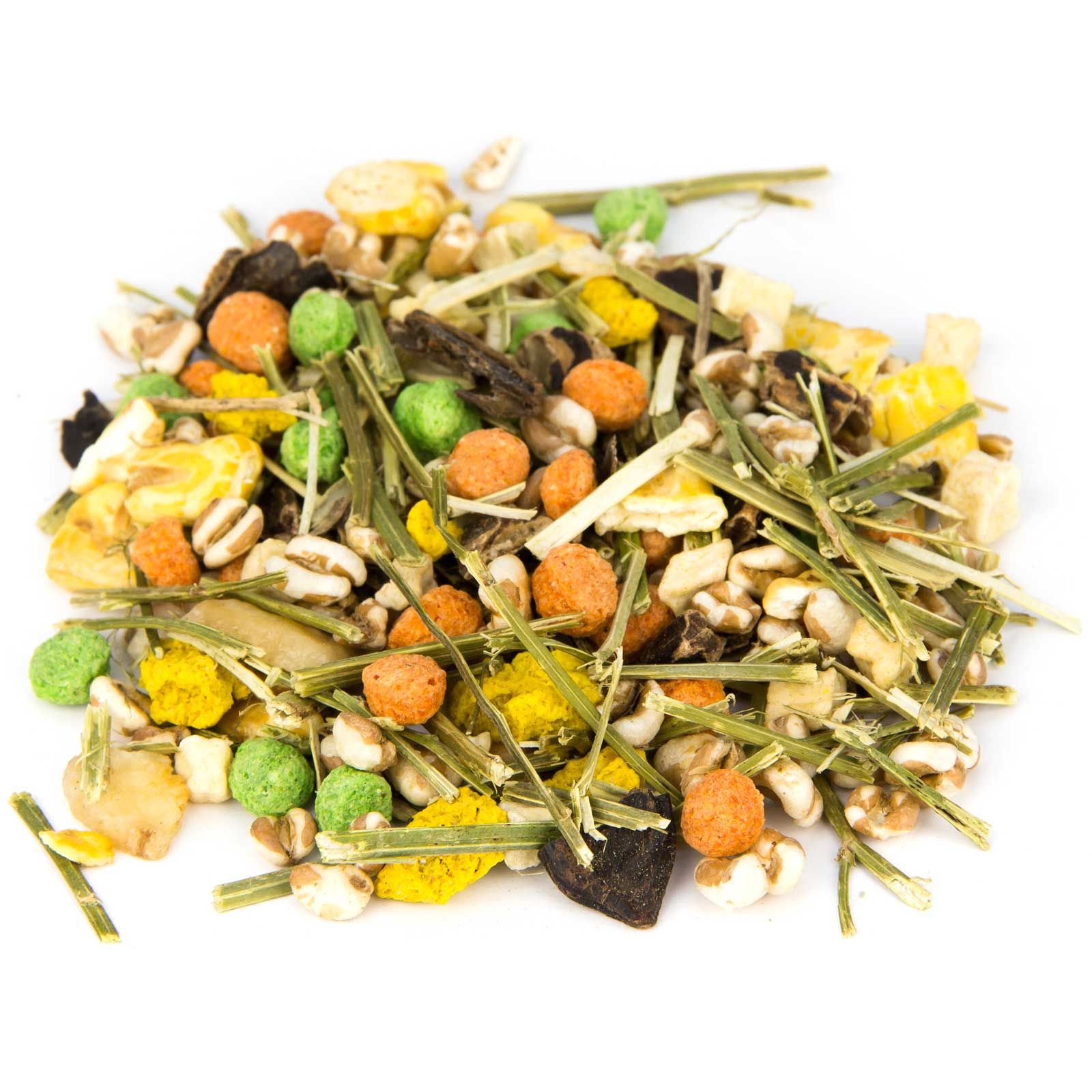 15,00 % Johannisbrot geschnitten , 12,50 % Weizen gepoppt, 12,50 % Mais gepoppt, 10,00 % Maiskroketten rot, 10,00 % Maiskroketten gelb, 10,00 % Alfalfaheu, 10,00 % Maiskroketten grün, 5,00 % Erdnüsse "Red Skin", 5,00 % Erbsenflocken, 5,00 % Bananenchips, 5,00 % Apfelwürfel